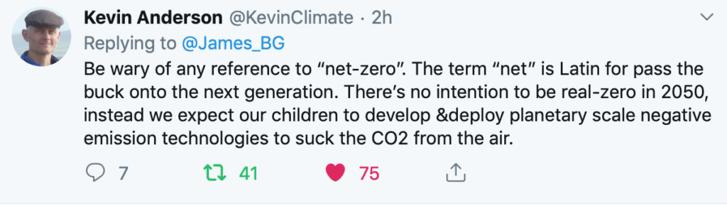 Negative emissions technology (NET). The IPCC reckons that 05-5.0 GtCO2 will need to be removed from the atmosphere come 2050. The biggest CCS plant, the one in Illinois, has so far managed to sequestrate 1.5 MtCO2. Net zero requires NET. Here’s how Kevin Anderson describes it: