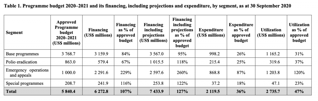 EB148/27 provides a report from the Director General updating the Board on the financing and implementation of the Programme Budget 2020-21, which was approved in May 2019 at WHA72. The total budget for the biennium is US$ 5840.4m, and comprises of 4 ‘segments’: Base programmes = US$3768.7m; Polio eradication = US$863m; Emergency operations and appeals = US$ 1000m; and Special programmes = US$208.7m. EB148/27 is, essentially, Tedros describing to the EB (and therefore accounting for) progress made in financing and implementing the budget during the first 3 quarters of its first year (i.e up to 30th Sept 2020). Table 1 (below) provides a summary of financing and projections for each of the four segments.