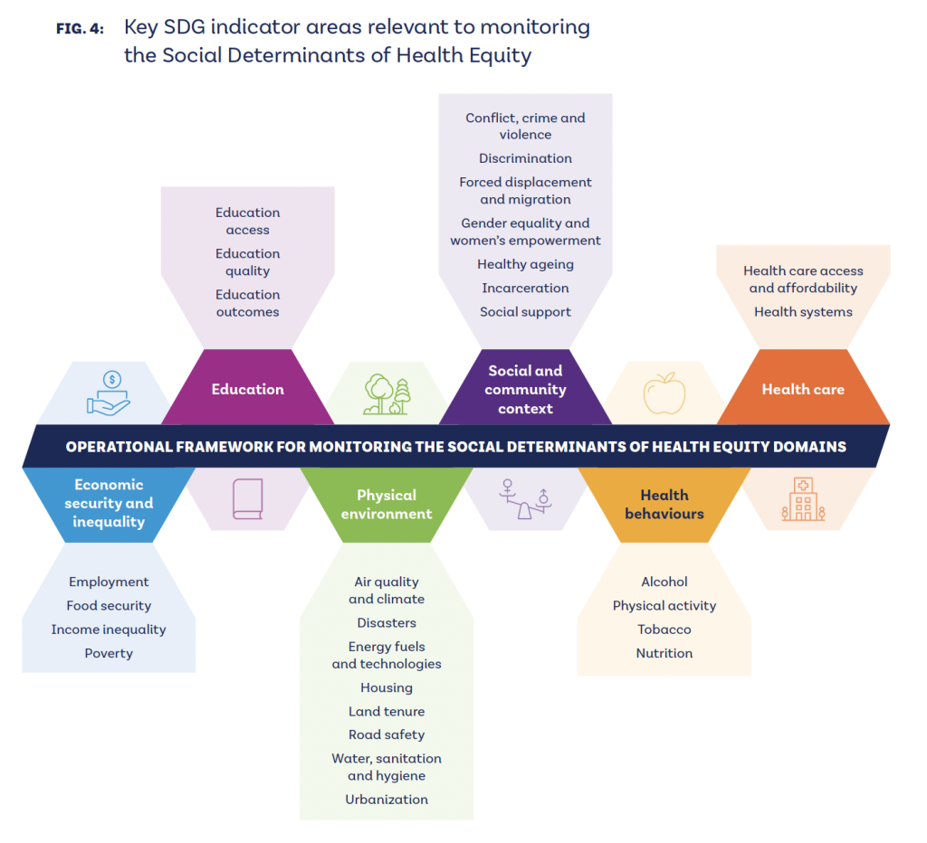 I think what’s important about global health are two things: the fact that it is global and the fact that it is about our health. Yes, I know, genius level insight, right? What I mean is that we are talking about the health of everyone on the planet – the global population – rather than just the health of some of us. The World Health Organisation published a report on health inequity in May this year. Maybe you read it? It noted the many successes we are – perhaps – all familiar with: maternal mortality, for example. It fell by 40% globally between 2000 and 2023, from 328 to 197 deaths per 100 000 live births. That’s progress. But the rate would need to fall to less than 16 deaths per 100 000 live births by 2040 to meet WHO’s Commission on the Social Determinants of Heath target. And it remains the case that women from disadvantaged or marginalised groups are still far more likely to die from pregnancy-related causes than women who are less disadvantaged or marginalised – and this applies in countries at all income levels. So, we have a long way to go. There are multiple factors – let’s call them social determinants – that affect one’s health. I’m just stating the obvious, here. Below is a figure from the WHO report that visualises the main ones.