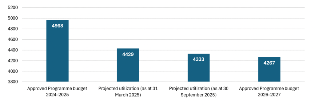 You’ll also recall that the approved base segment of the program budget for 2026-27 – $4.2bn – was significantly less than the $4.9bn amount agreed by WHO’s Program, Budget and Administration Committee (PBAC) at the beginning of 2025. How is the Secretariat going to manage that $700m reduction in budget? I’ve already mentioned the cost containment measures introduced last year (and see table 5 of A78/19 for a breakdown), but the report notes “a corresponding slowdown in program budget implementation” (p7) Perhaps that’s not surprising as downsizing the workforce is going to result in fewer projects being implemented. But the slowdown in implementation meant that utilisation of funds also reduced. The figure below shows that in March 2025 the Secretariat was anticipating that $4429m of the total program budget would be spent. That decreased by $96m to $4333m or 77% of the program budget in September, but by the end of 2025 the report projects that around 87% will be utilised. This level of utilisation of funds was carefully managed in 2025 so that by January 2026 – i.e. now – “WHO is fully prepared to operate effectively within the reduced Programme budget 2026–2027” (p7).