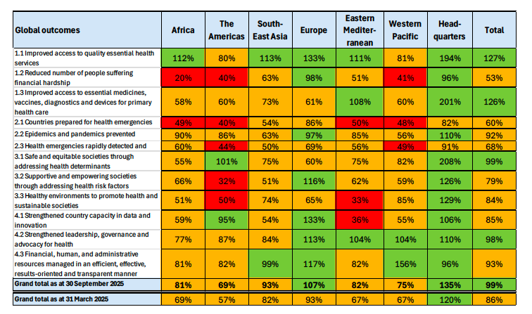 Now that the dust has settled on 2025, it’s possible from this report to get a more accurate assessment of WHO’s finances during 2024-25 and a better sense of what is in store in 2026-27. The 2024-25 program budget was $4968m and as of 30th September 2025 had been financed 102% ($5059m). While that may seem like good news – yaay, the WHO has received more money than it budgeted for – it disguises the fact that some of the WHO’s four strategic priorities (SP) were over funded, but with money that can’t be moved around to cover under-funded priorities. For example, SP1 (1bn more people benefitting from universal health coverage) was 118% funded while SP2 (1bn more people better protected from health emergencies) was only 71% funded. You can see the famous heatmap below, which shows (for example) that within SP2, WHO’s priority to help prepare countries in the Americas for health emergencies is only 40% financed. These are familiar and chronic ‘pockets of poverty’ that persist because of tightly earmarked (i.e. inflexible) voluntary funding from donors.