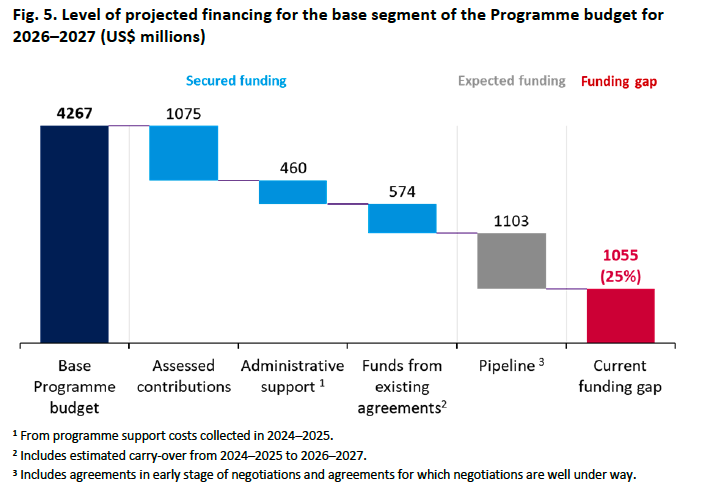 Looking forward, the figure below shows projected financing for the base segment of the program budget 2026-27. Being 75% financed might seem like good news for this time in the funding cycle, but it’s not really. For one thing, as already noted, the 2026-27 budget is less than the 2024-25 budget – $700m less (meaning less money in total has to be accounted for). If the budgets were the same, we would be looking at 64% of the program budget funded. This is still more than what it was at the equivalent point in the 2024-25 funding cycle (i.e. January 2024) when it was 58%. But…this time around we have the benefit of the Investment Round (which didn’t exist for the 2024-25 budget) which has effectively front-loaded some of the 2026-27 budget. This is good news in terms of predictability, but as the report warns: “Given the highly constrained financial environment, closing the remaining funding gap for 2026–2027 will likely be more challenging than it has been in previous bienniums”.